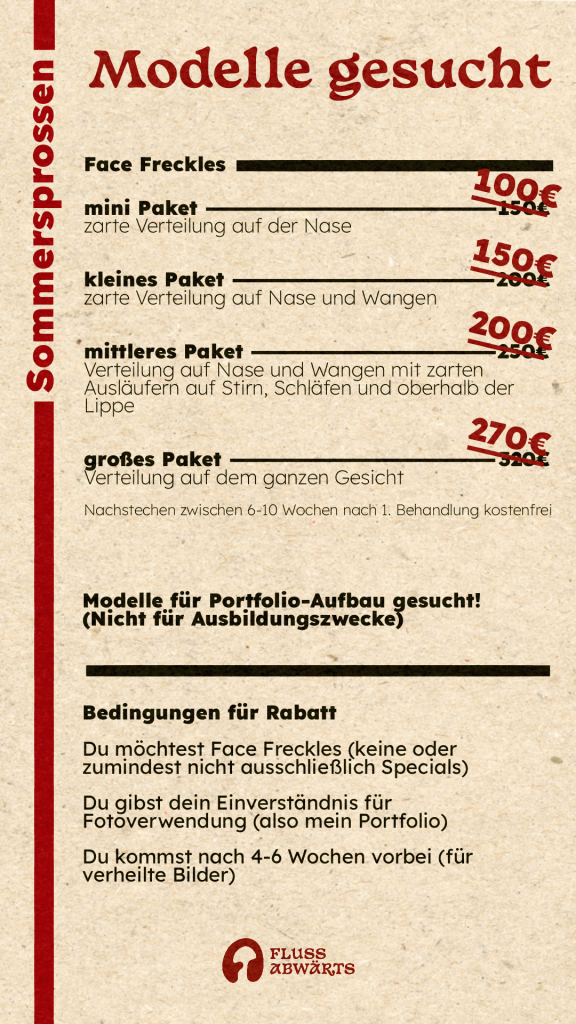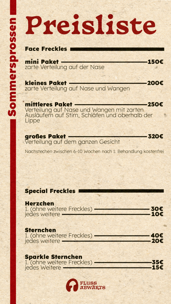 Preisliste für Fake Freckles im Gesicht (Face Freckles) und für Special Freckles – die am Körper und im Gesicht platziert werden können.